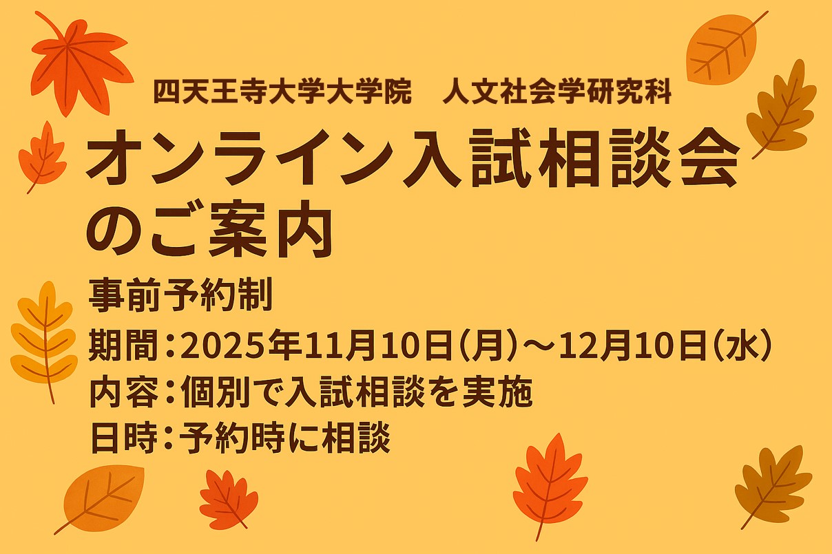 四天王寺大学大学院人文社会学研究科人間福祉学専攻ではオンライン入試相談会を開催いたします。人文社会学研究科の博士前期課程・博士後期課程の紹介、履修科目、福祉専門学校からの大学院進学(事前資格審査)などについて説明いたし […]