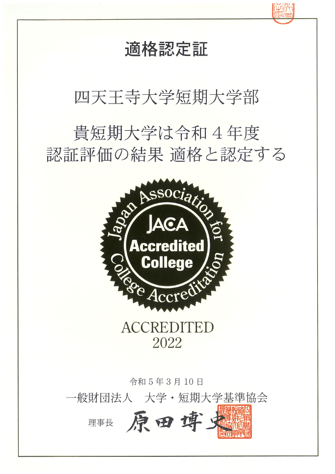四天王寺大学短期大学部は、一般財団法人大学・短期大学基準協会による令和4年度 認証評価の結果、令和5年3月10日付で「大学・短期大学基準協会が定める短期大学評価基準を満たしている」ことから「適格」と認定されました。