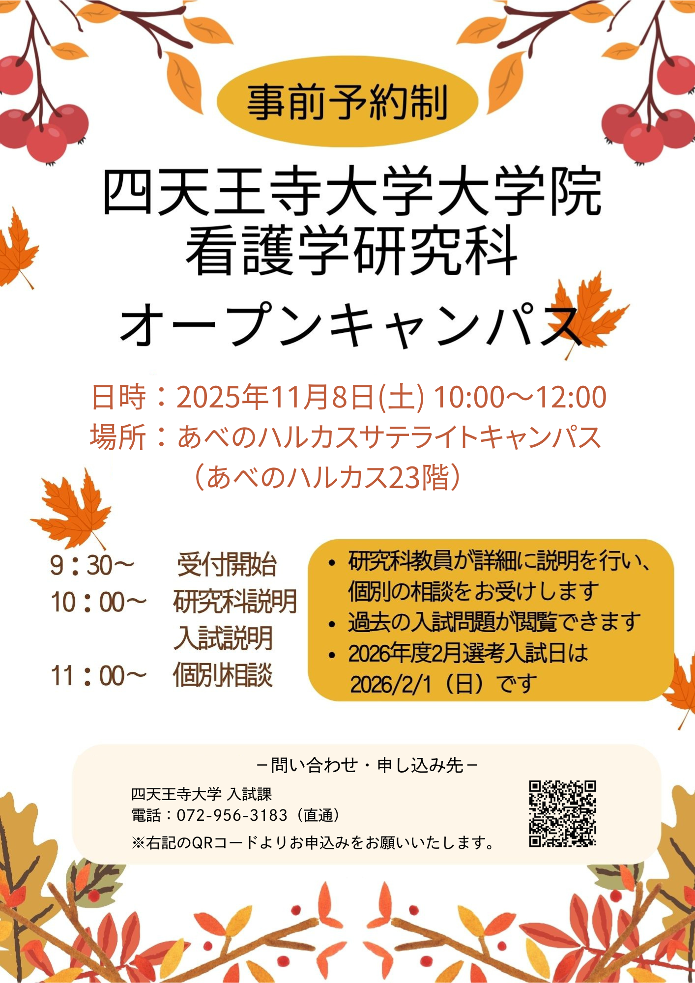 四天王寺大学大学院看護学研究科の博士前期課程・博士後期課程の分野・領域の紹介、履修科目、長期履修制度、看護専門学校卒業からの大学院進学(事前資格審査)などについて説明いたします。また、オープンキャンパスでは、教員が皆様の質問に丁寧に対応いたしますので、この機会に是非お気軽にご参加ください。