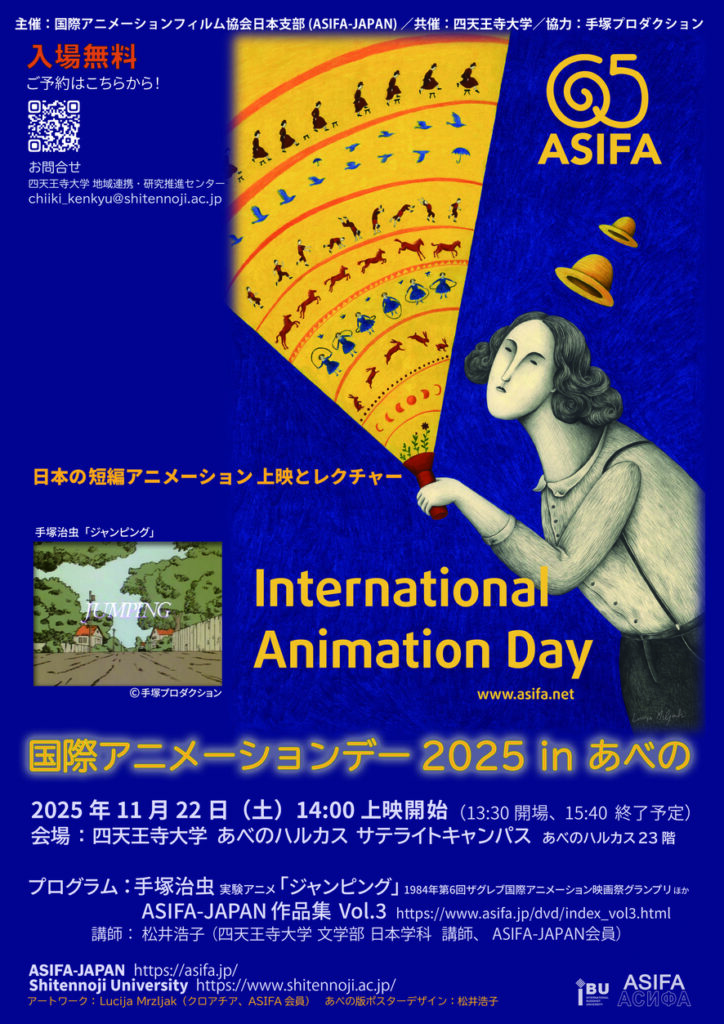 11月22日(土)、四天王寺大学あべのハルカスサテライトキャンパスにて、国際アニメーションフィルム協会 日本支部主催の「国際アニメーションデー2025 in あべの」を開催します。