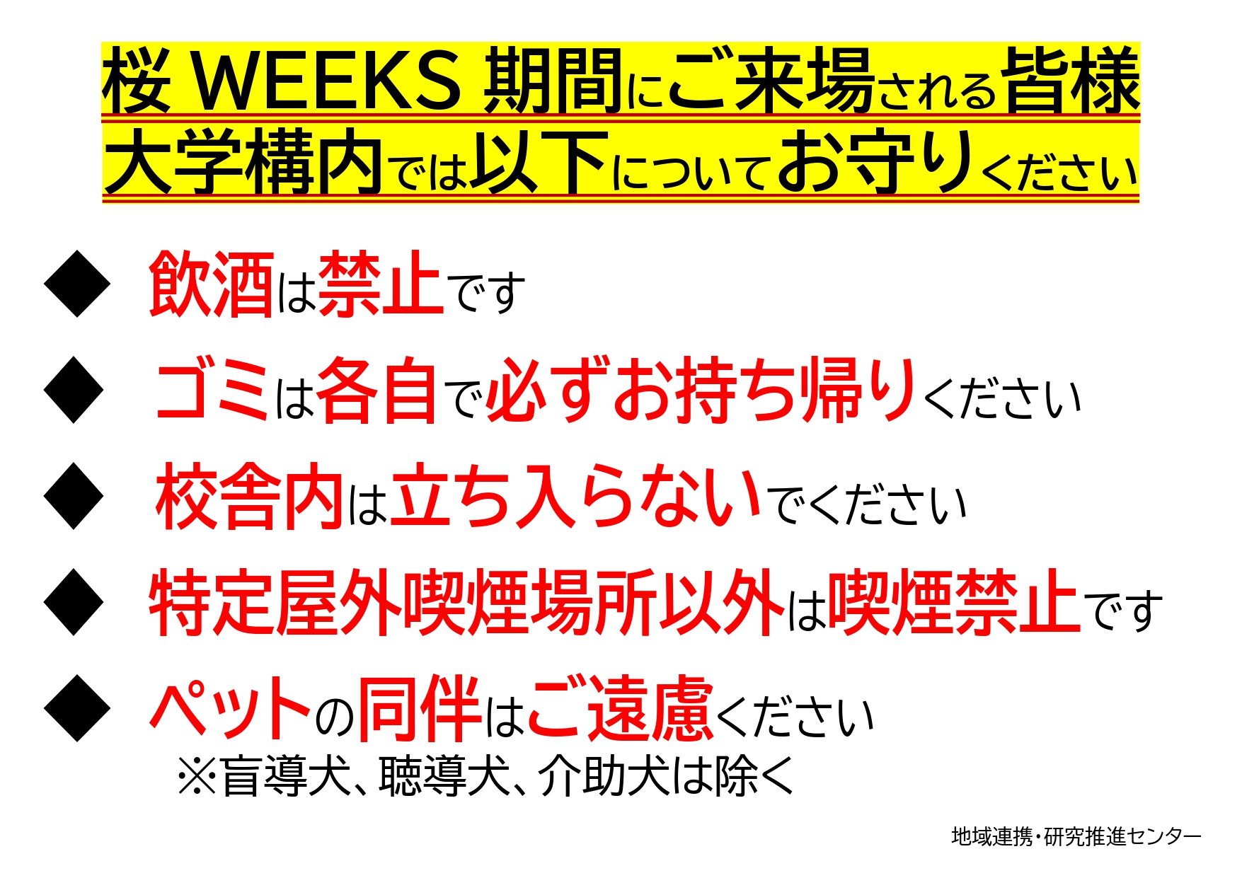 地域の方々に桜をご鑑賞いただけるよう、3月27日(金)~4月12日(日)の期間、”桜WEEKS”を開催しております。以下の決まりを守っていただき、ご自由にご鑑賞ください。