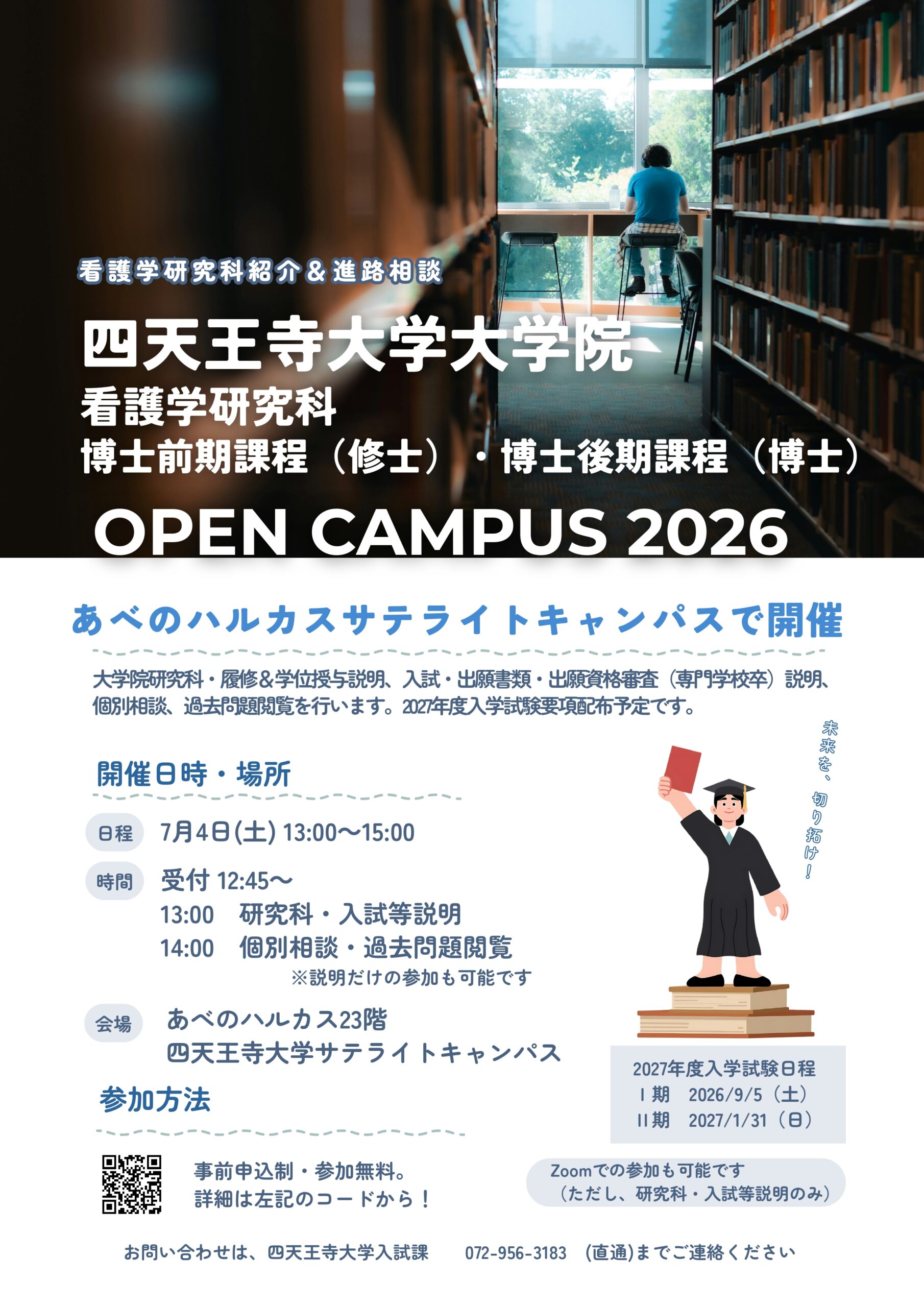 四天王寺大学大学院看護学研究科の博士前期課程・博士後期課程の分野・領域の紹介、履修科目、長期履修制度、看護専門学校卒業からの大学院進学(事前資格審査)などについて説明いたします。また、オープンキャンパスでは、教員が皆様の質問に丁寧に対応いたしますので、この機会に是非お気軽にご参加ください。