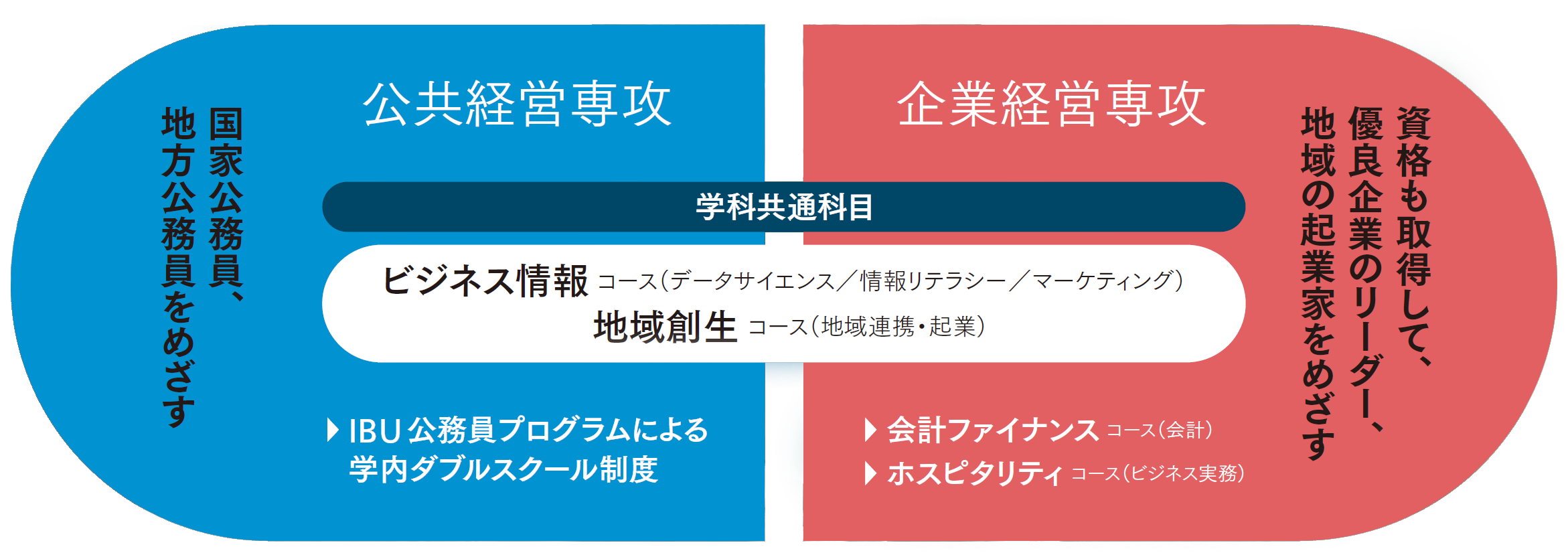 経営学科のカリキュラムは、公共経営専攻と企業経営専攻を中心に、共通コースとして「ビジネス情報コース」「地域創生コース」、さらに企業経営専攻には「会計ファイナンスコース」「ホスピタリティコース」を新設し、夢を叶えるための学びを体系的に提供します。データサイエンスや地域活性化、起業家精神やホスピタリティの重要性が高まる今、個々の特性と体系的な学びを組み合わせて、夢の実現に向けて一人ひとりが成長します。
