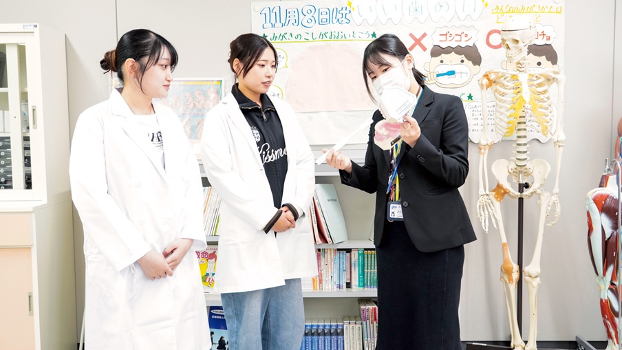 看護に加え教育の学びを活かして、特別支援学校で健診の補助や保健教育の実践を行います。教育現場に触れることで、子どもたちが健康に安全に楽しく学校生活を送るためにどうすればいいか、養護教諭または教員免許を有する看護師の価値観の醸成をめざします。