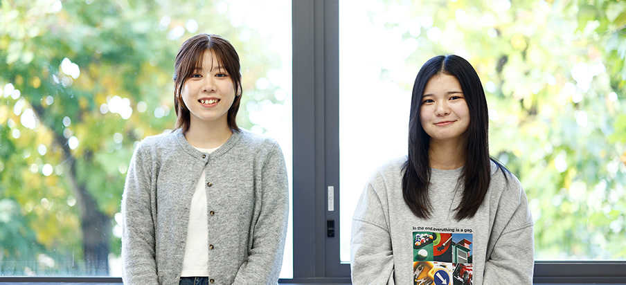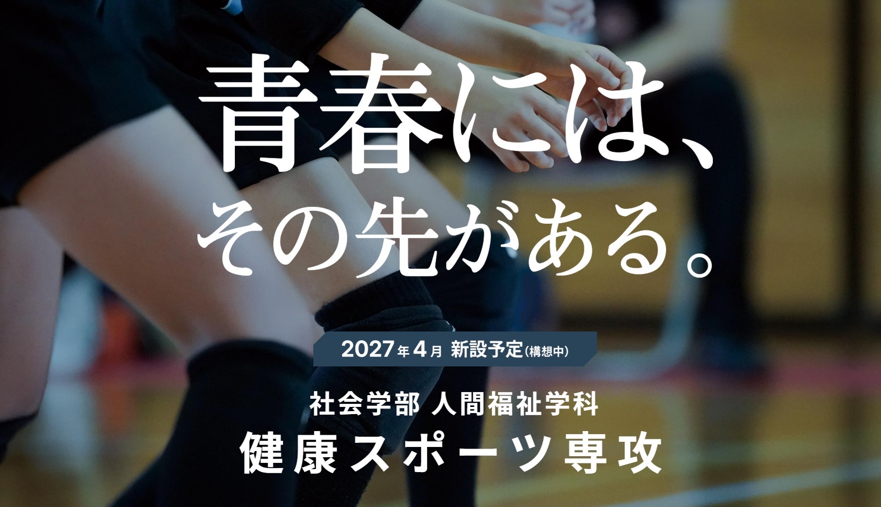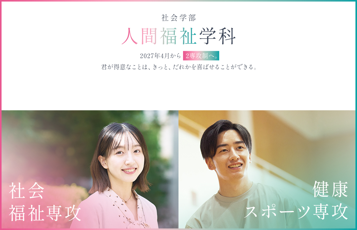 「社会学科」では、4つのコースを自由に横断し、自分らしく主体的に学べます。「人間福祉学科」は、地域共生社会について探求する「社会福祉専攻」と、人の心と体の健康を支えるための知識・技能と実践力を養う「健康スポーツ専攻」の2つの専攻の学びで、専門性を身につけていきます。