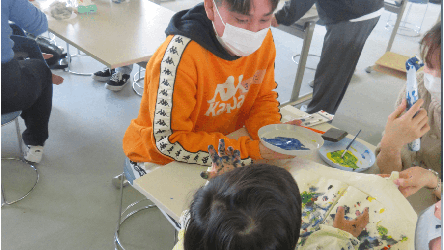 障がいのある子どものアート活動をサポートするプロジェクトを実施しています。四天王寺福祉事業団と協力し、地域で暮らす障がいのある子どもたちやその家族、障がい児福祉分野の専門職を大学に招き、アート活動を行っています。表現が難しい子どもたちが絵を描き、オリジナルのトートバッグを作成します。学生は参加者のサポートや活動の補助を行い、子どもたちの個性が輝く場を創り出します。