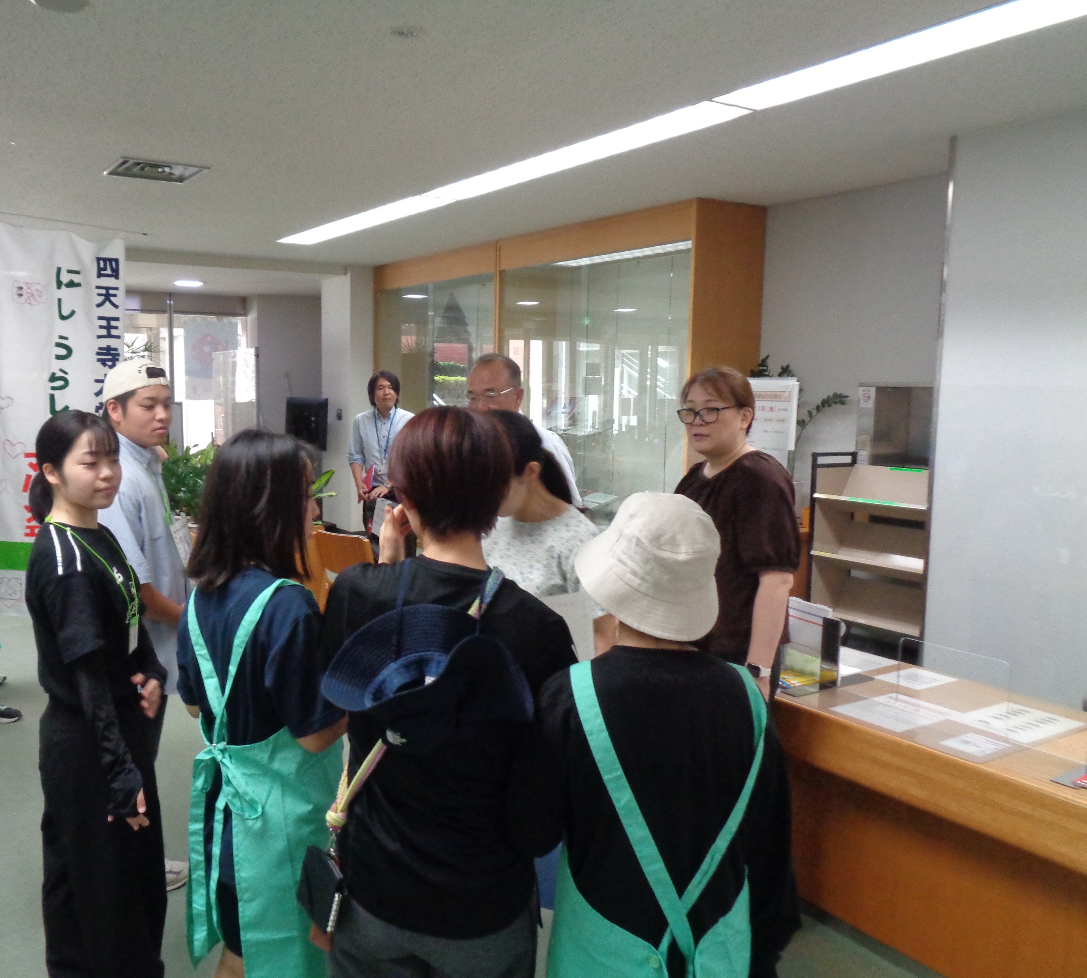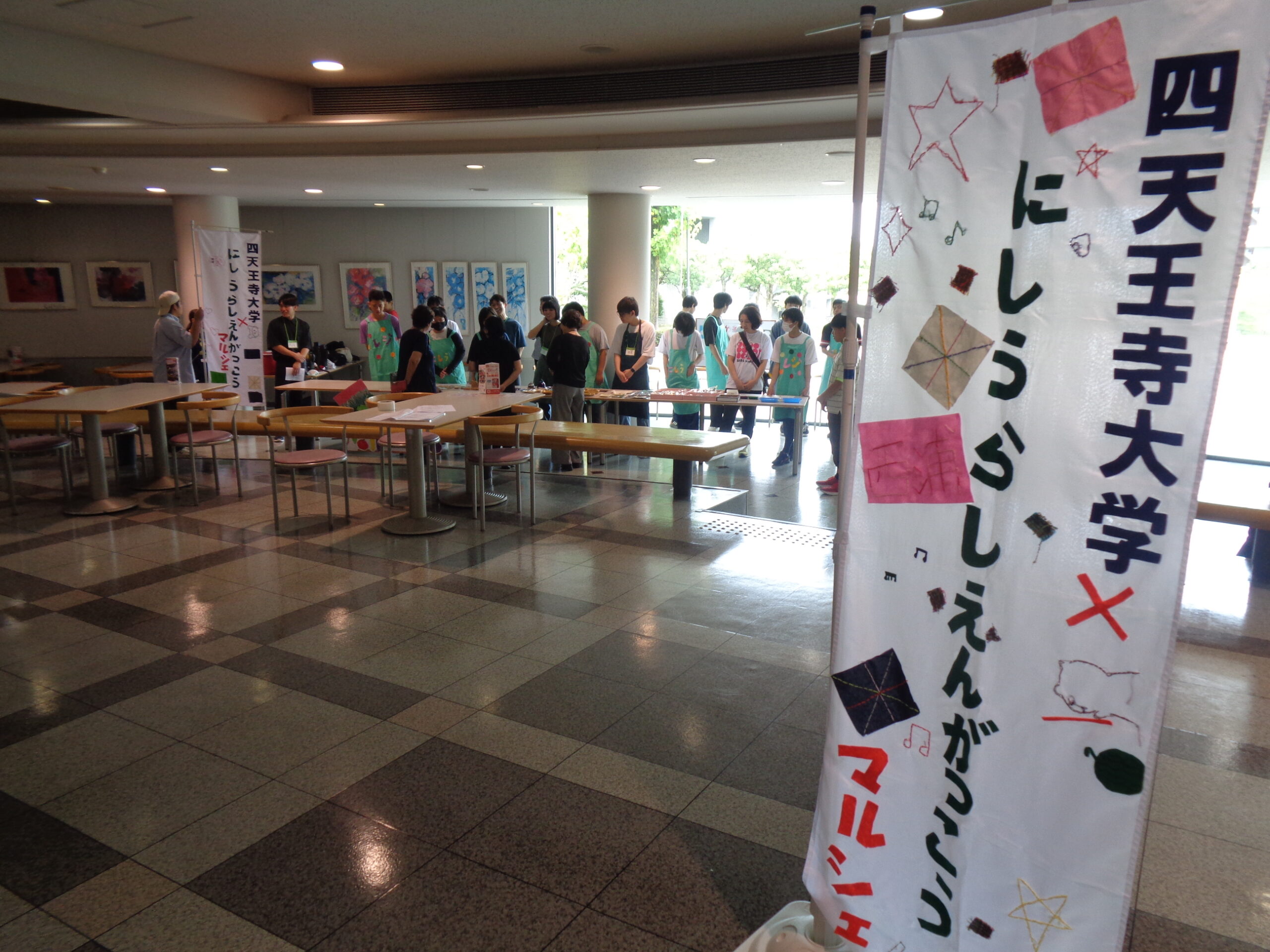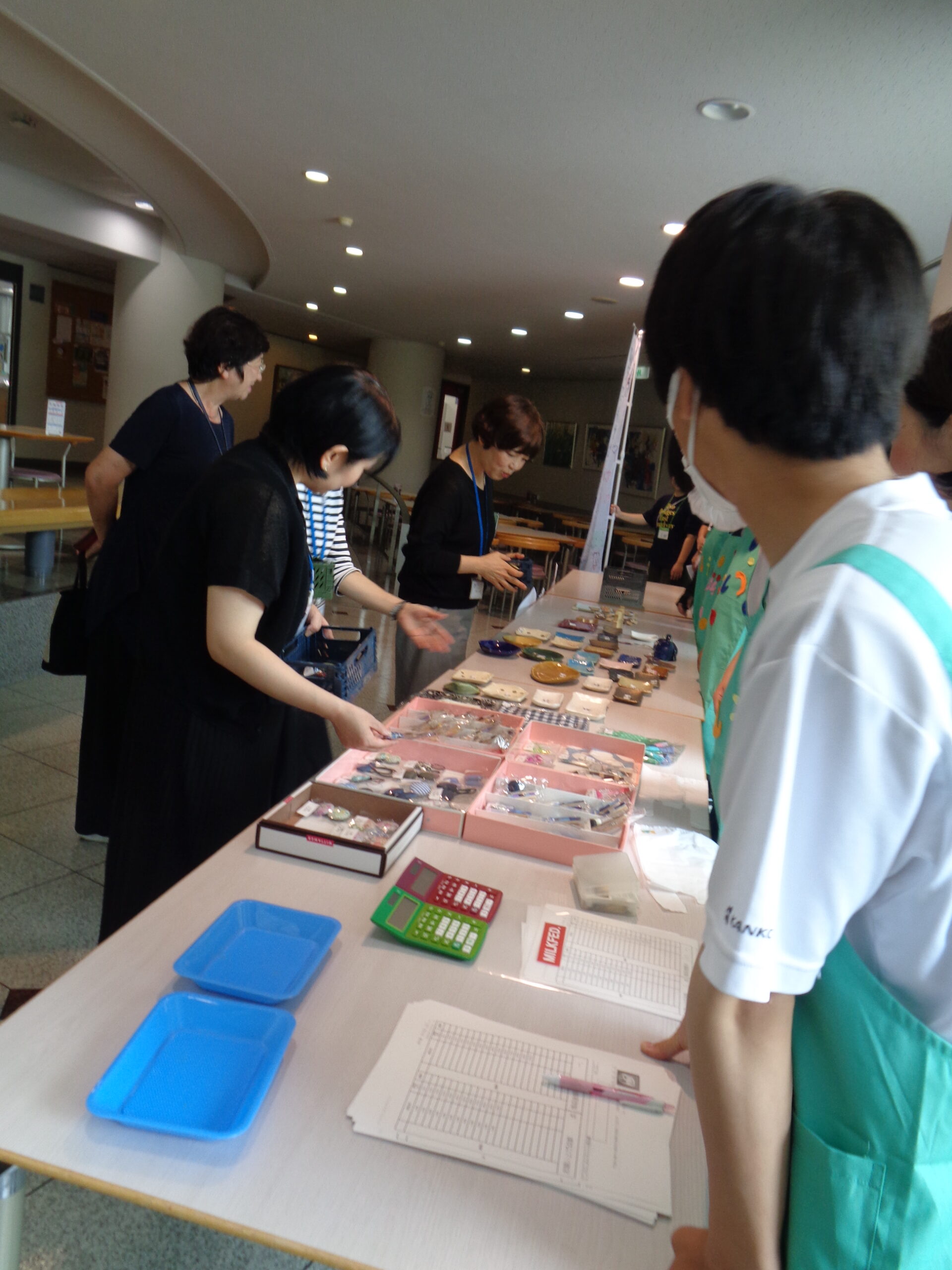 教育学部教育学科 土口千惠子教授の「インクルーシブ教育の探究」科目を履修して特別支援をめざす教育の学びを深める4年生と3年生の学生が、大阪府立西浦支援学校と交流及び共同学習を行い、生徒が作った野菜や陶器のお皿、木工製品、皮革製品などを自ら販売する職業体験の機会を設けました。当日は商品を並べて売る販売班と、学生と一緒に各部署を周り販売会を周知する呼び込み班に分かれ販売活動を行いました。生徒たちは笑顔で商品を紹介し、丁寧で元気に接客する姿、暑い中、大きな声を出して販売会の案内をして周る姿に大変感激し頼もしさを感じました。今後も継続した交流を重ね、双方がともに学び合える学習活動を行ってまいります。