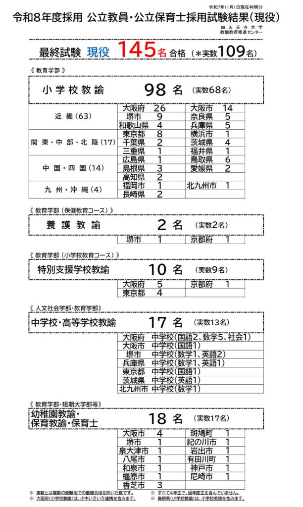 令和8年度(令和7年度実施)教員採用試験について、小学校98名(実数68名)、中学校・高等学校17名(実数13名)、養護教諭2名(実数2名)、特別支援学校10名(実数9名)の4年生が現役合格しました。