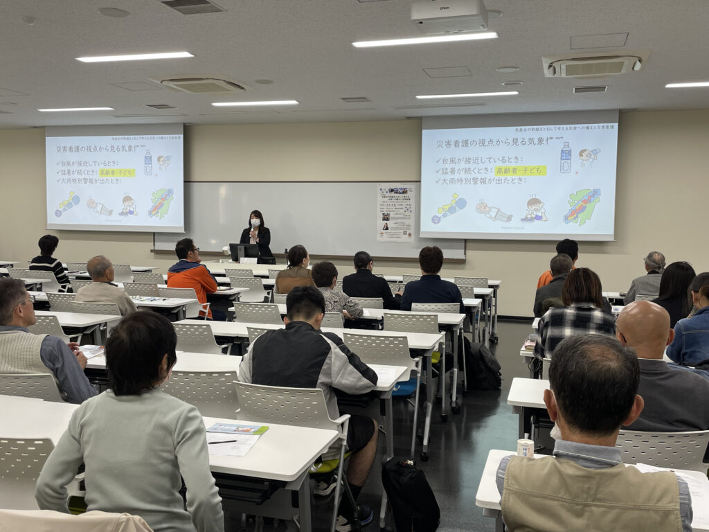 第2部では、本学看護学部の亀井 縁教授を講師として、気象庁が発信する警報や予報をどう読み取り、災害時に自分や家族の命を守る行動につなげるかを、災害看護の視点から高齢者や子どもなど要配慮者への支援や、地域での情報共有の工夫についても触れてお話しいただき、身近な天気予報を防災に役立て、避難のタイミングや準備を考えるとともに、日常生活に活かせる科学的な知恵を参加者と一緒に考えました。