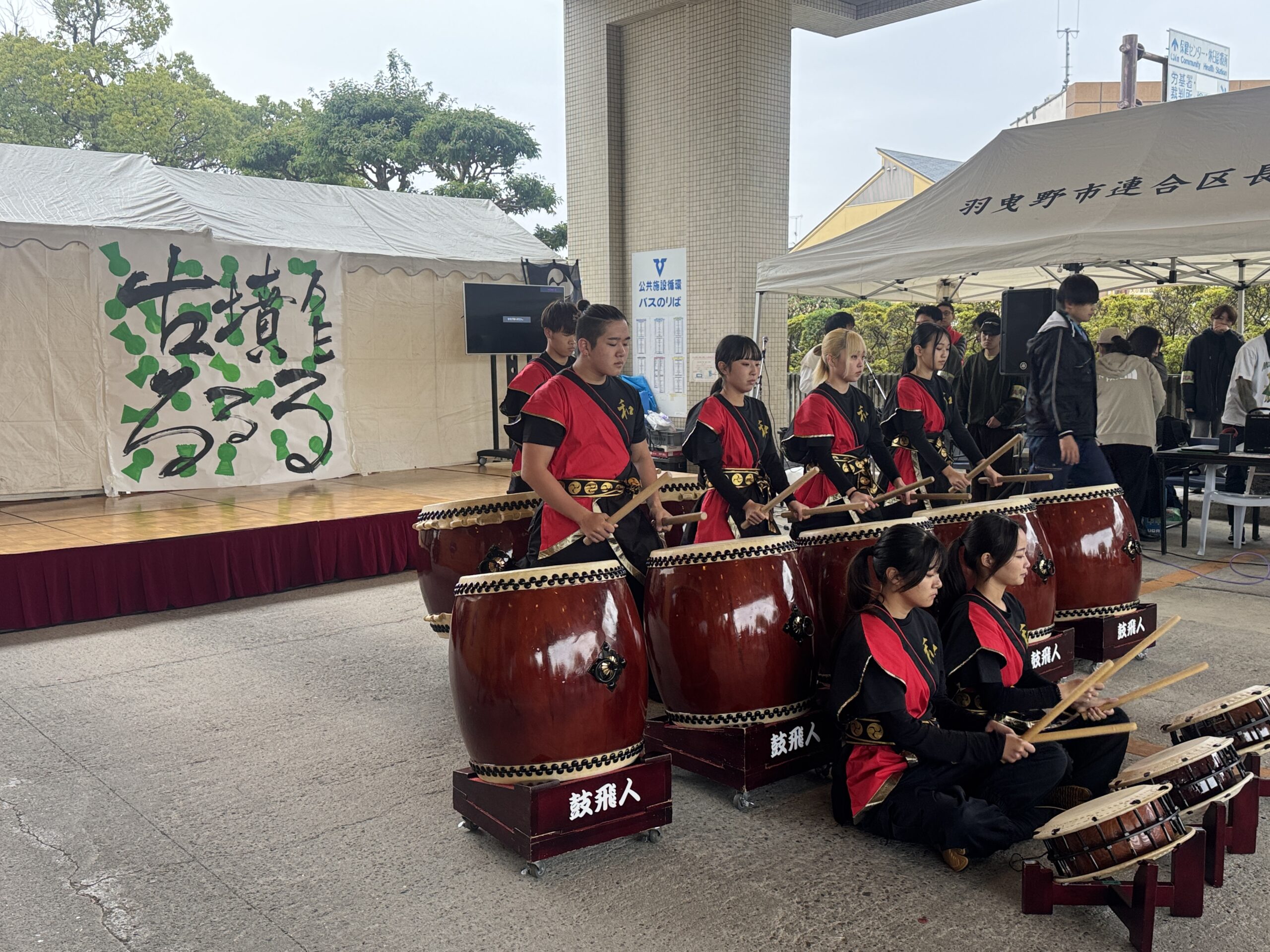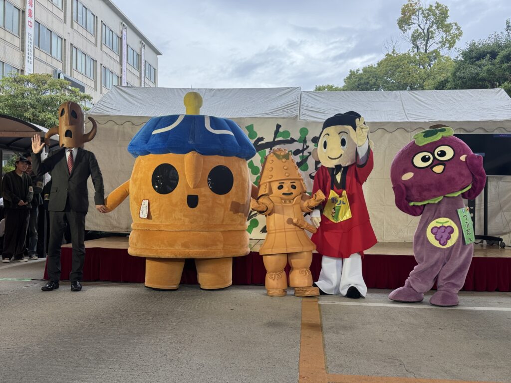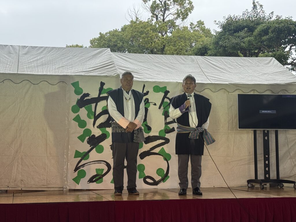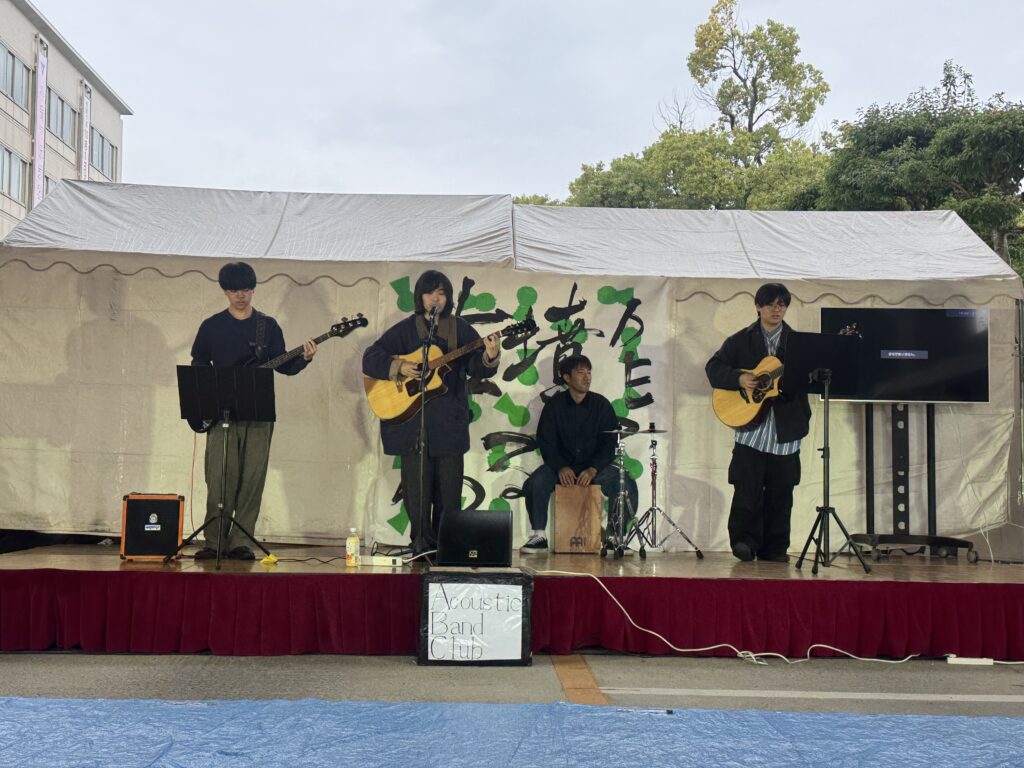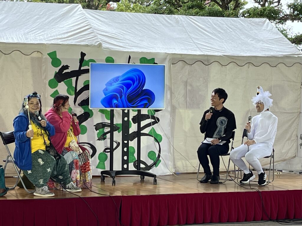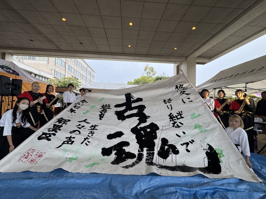 当日は、あいにくの雨でしたが、本学からたくさんのクラブ団体やゼミ生、模擬店を出店しました。ステージにあるタイトル「古墳でるるる」は書道部が作成し、今年より司会は本学の浅田さん(教育学科2回生、アンカークラブ所属)で進行しました。日本学科の辰巳講師(研究分野 日本考古学)が古墳クイズやトークショーにも登壇。地域の方に世界遺産登録の百舌鳥・古市古墳群をわかりやすくお話をしていただきました。地域×羽曳野市×四天王寺大学で打ち合わせを重ね、地域を盛り上げることができ、雨の中でもたくさんの方にご来場いただきました。