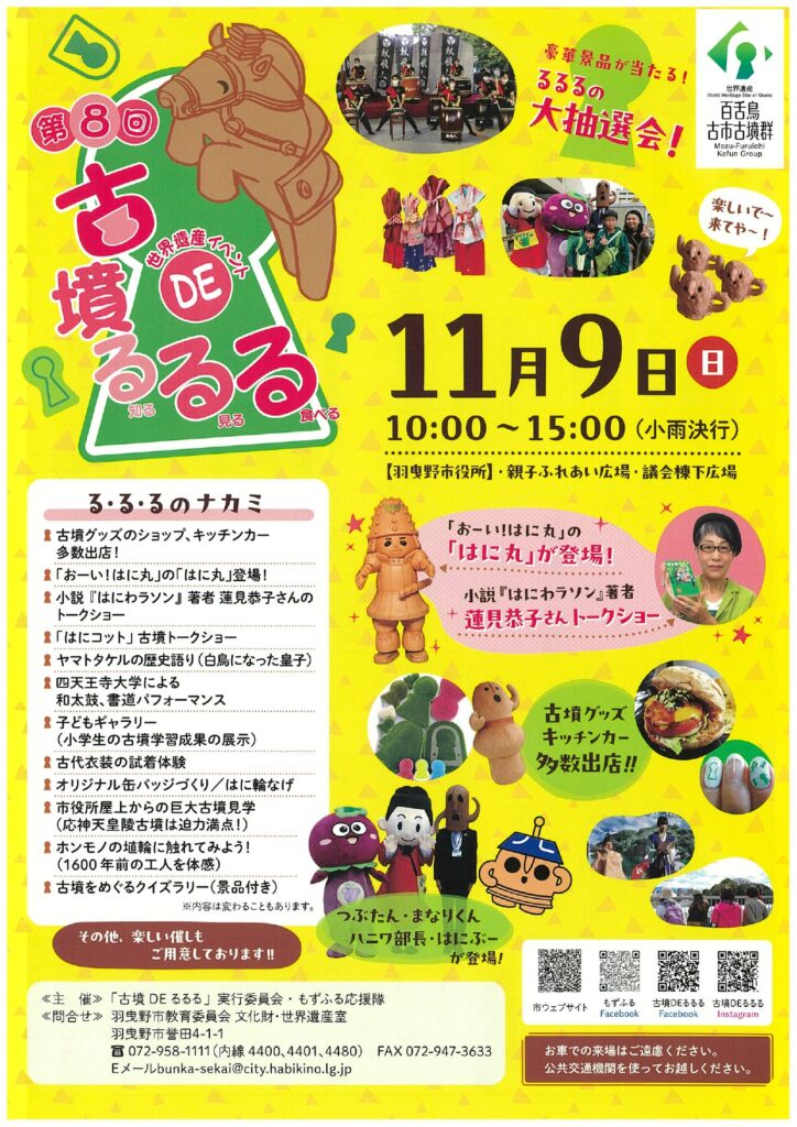 2025年11月9日(日)『古墳DEるるる~知る・見る・食べる~』はこれまで古墳や世界文化遺産に興味・関心のなかった市民の方にも、イベントを通じ、「百舌鳥・古市古墳群」のさらなる価値や魅力を知ってもらうことを目的として、「百舌鳥・古市古墳群」を応援するため活動する市民団体である「もずふる応援隊」が中心となって運営しています。