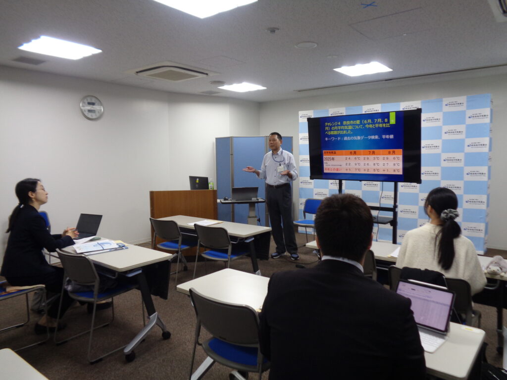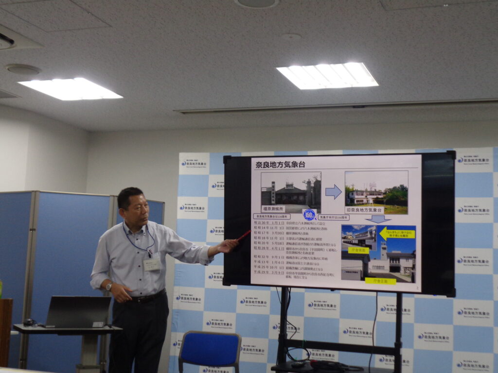 はじめに奈良地方気象台より、気象観測や予警報の発表など、気象庁の業務についてご紹介いただいたのち、若手職員の方から、自治体と連携した地域における防災力向上に関する取組や、測器点検や予報官の補助など、日々の具体的な業務内容についてお話しいただきました。