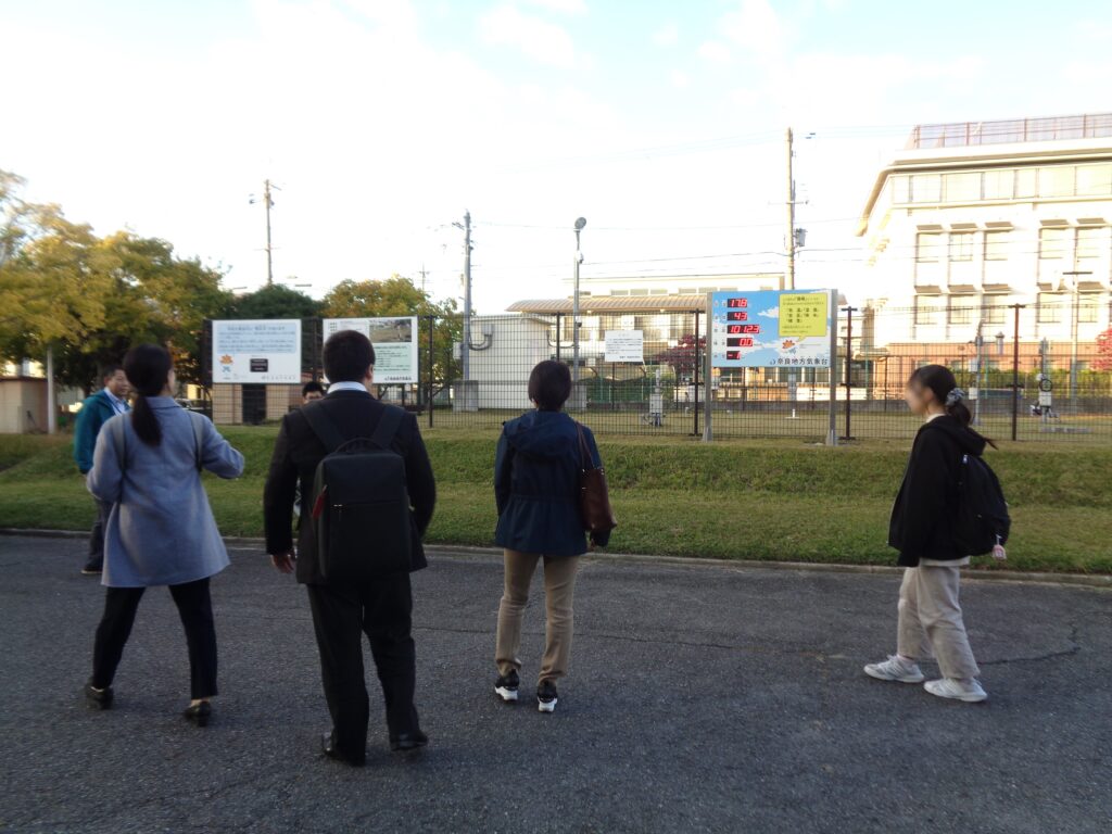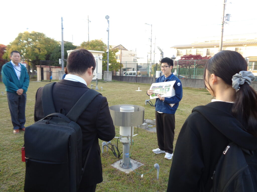 ワークショップ後は、気象台から約1km離れた場所にある観測露場を見学させていただきました。雨量計や積雪計等の観測機器について、その仕組みや計測方法などをご説明いただきました。