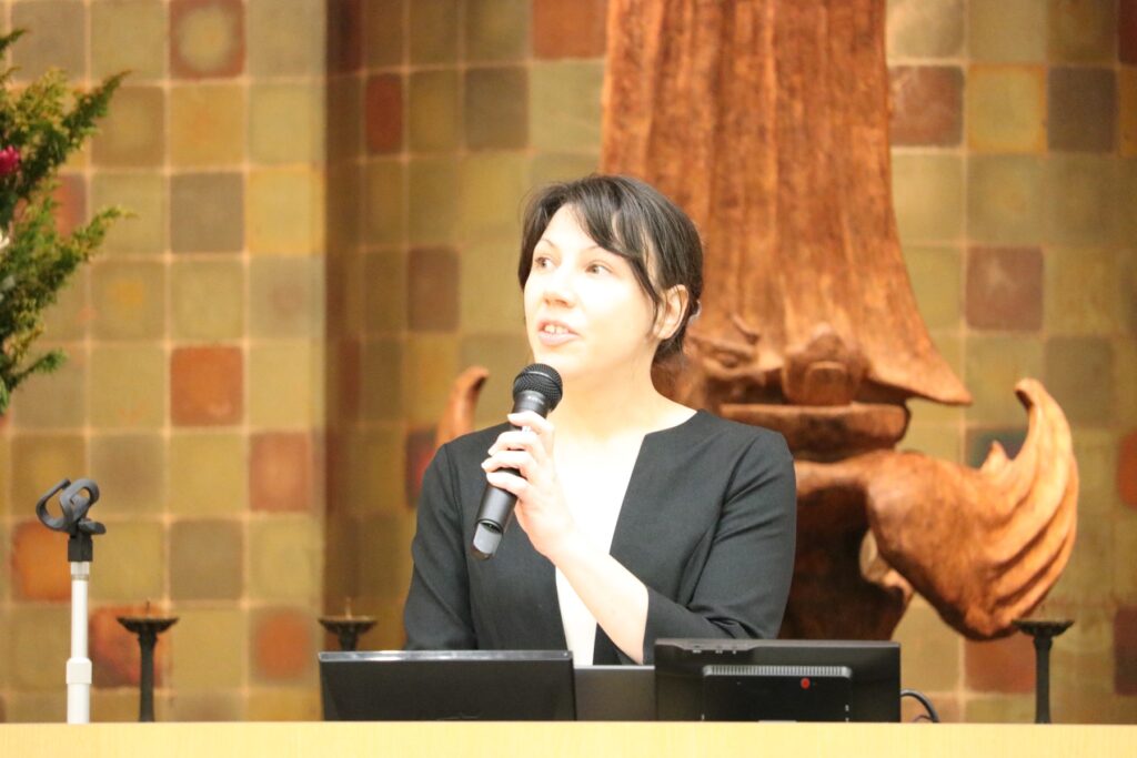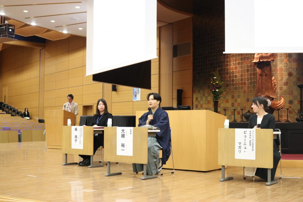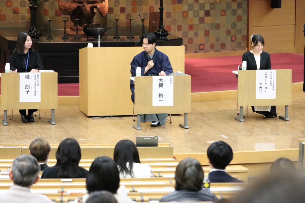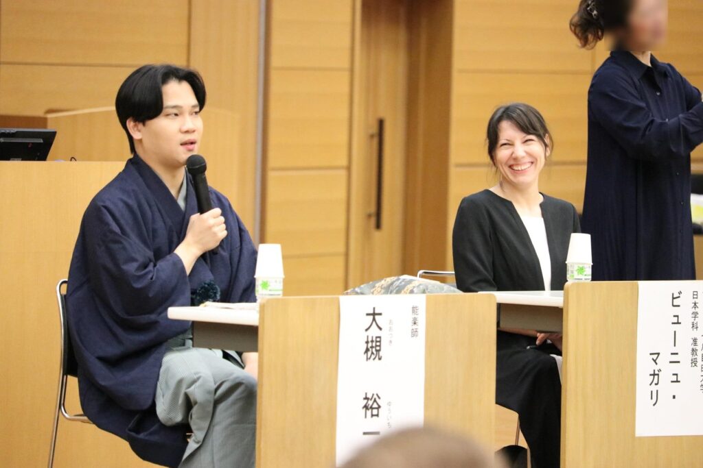 第二部では、本学文学部日本学科にて伝承文学、ポップカルチャー等における「怪異」のモティーフを研究し、それらが登場するマンガやアニメの考察をされている植准教授にマンガ解説、ブリュッセル自由大学日本学科にて文化交流・伝統芸能・能楽・演劇を専門とし、現代における「新作能」を中心に研究されているビューニュ准教授に能・狂言解説で講演いただきました。