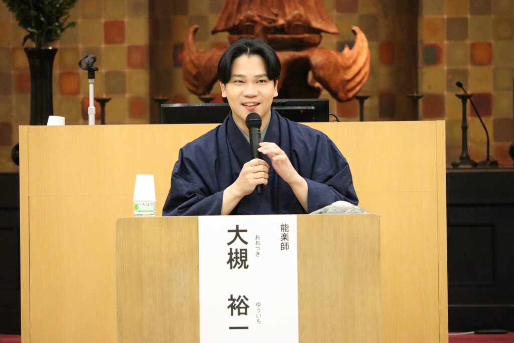 今もっとも注目を集める若手能楽師 大槻 裕一氏を迎え、マンガの世界がどのように能・狂言へと姿を変えたのか、作品の見どころを交えながら、ビューニュ准教授、植准教授と3名によるトーク形式で楽しく語り合いました。