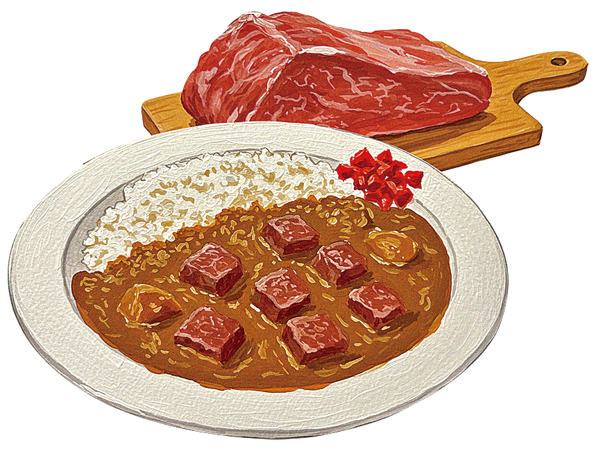 主役級に存在感を放つ大きめの牛肉。2~3種のルーを合わせてとろとろに仕上げる、母のごちそうカレー。