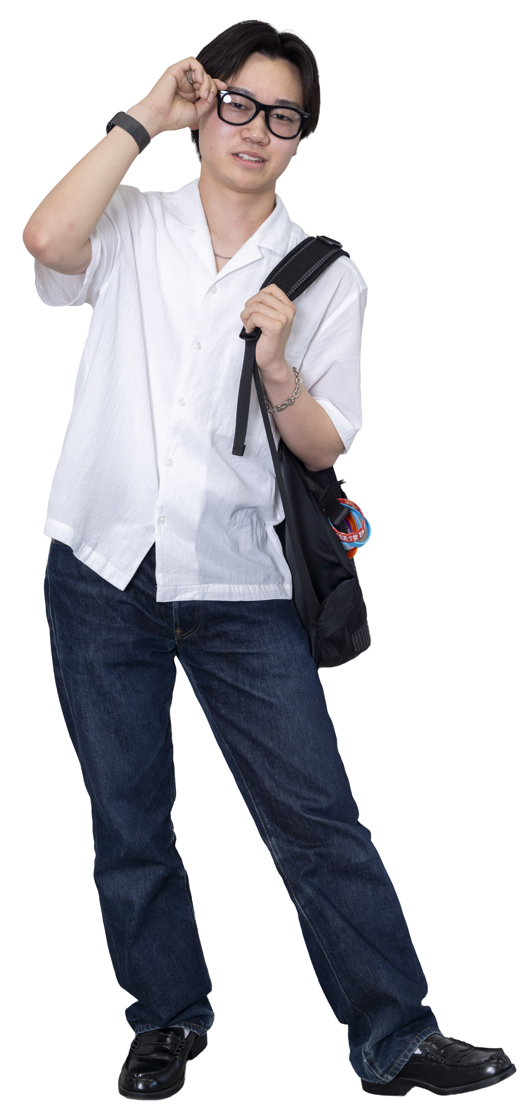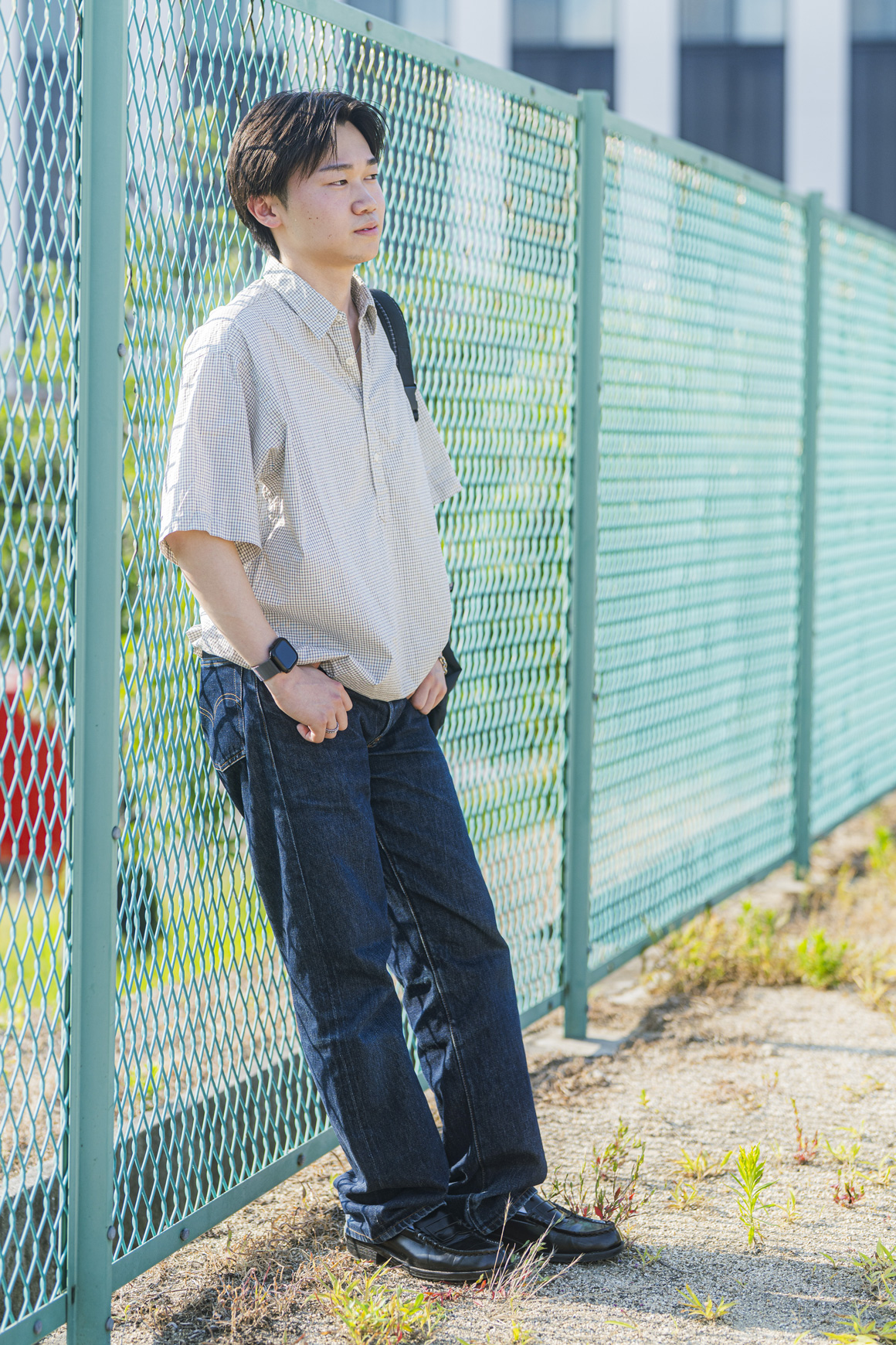 涼しげ&シンプルなシャツコーデにして、足元をローファーで引き締めました。こだわりは、古着を1枚取り入れること。今日は母からもらった90年代のリーバイスを履いています。