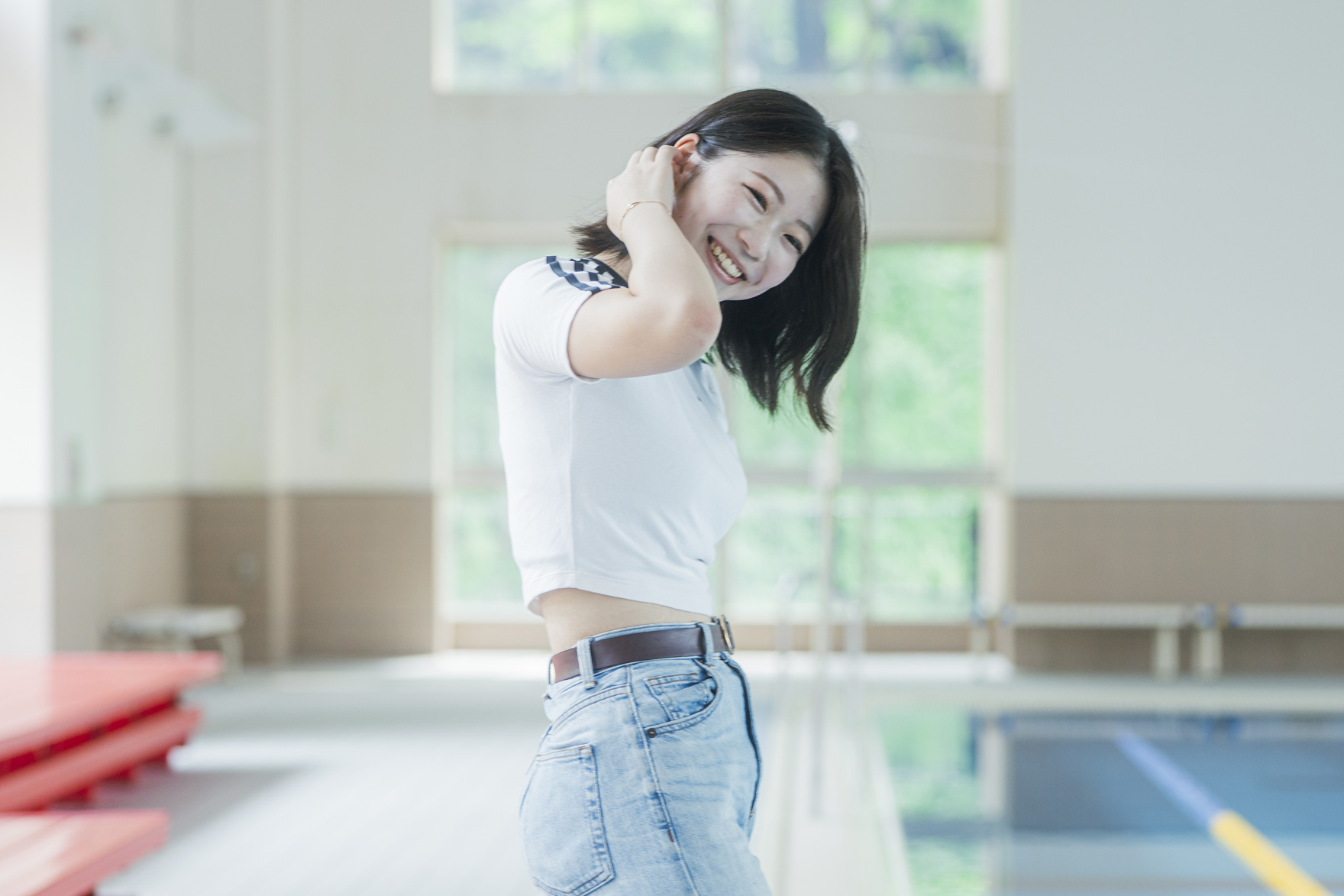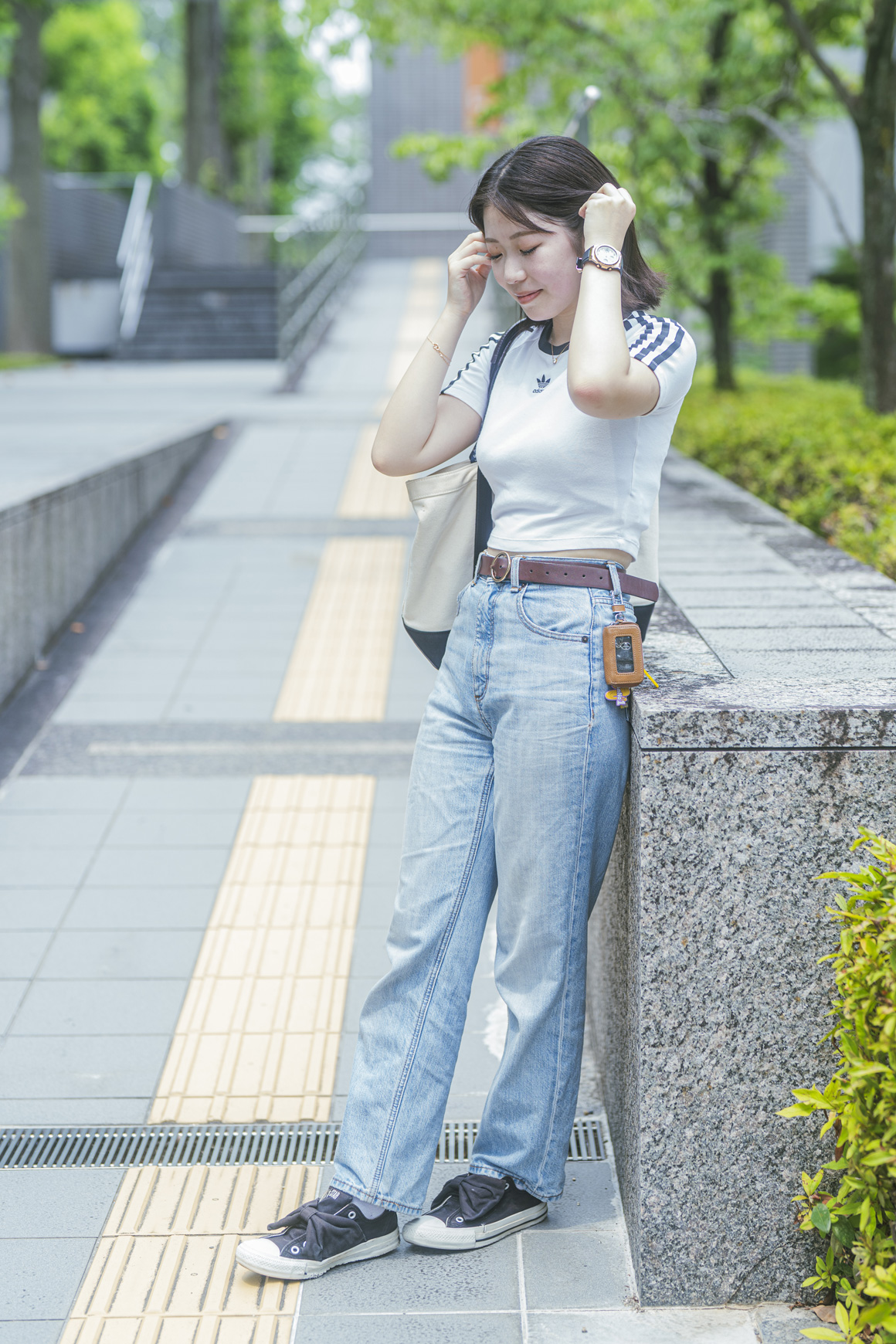 夏らしく、デニムでカジュアルにまとめました。動きやすいパンツスタイルで、トップスは短めのものが好き。ピアスなどのアクセサリーは、シンプルなものを選ぶことが多いです。