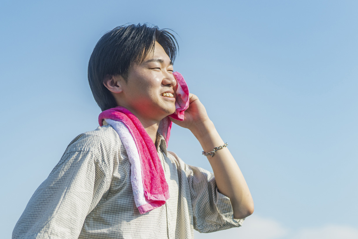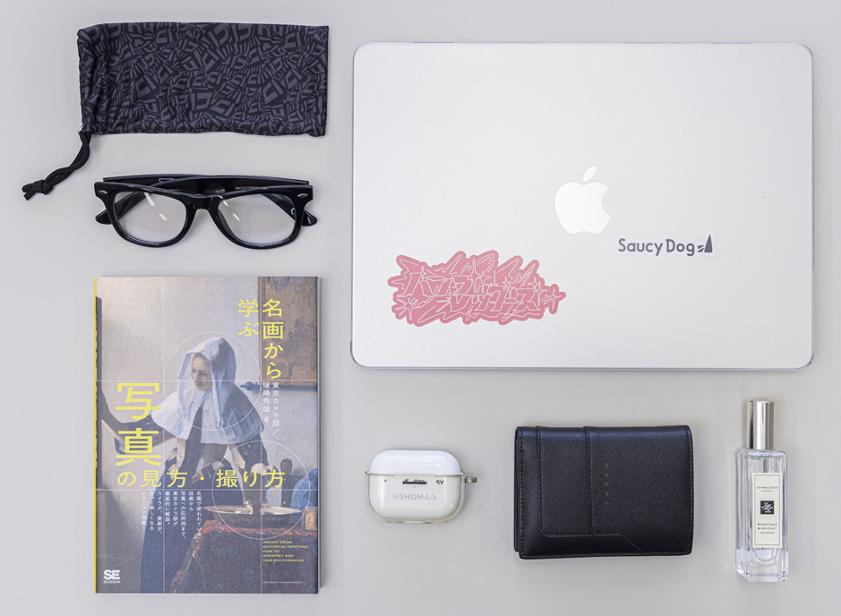 朝から日差しがきつくてまぶしい夏場は、サングラスが必需品です。調光レンズなので、室内でもそのまま使えて便利。存在感のある黒縁は、ファッションのポイントとしても重用します。