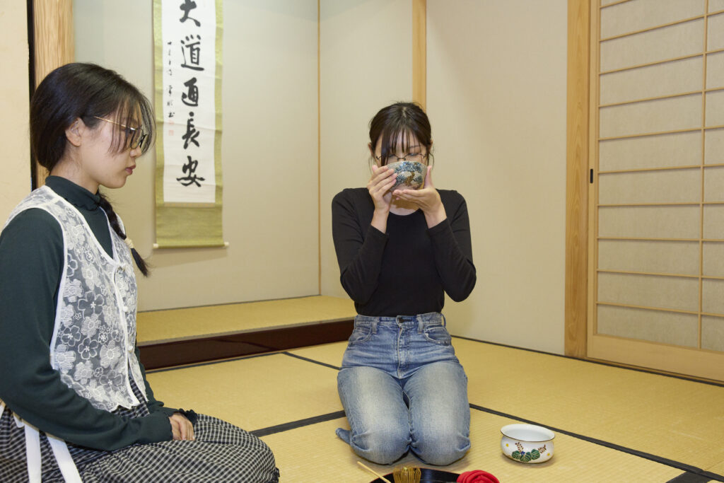 [綾野さん]コロナ禍で飲食系の活動が難しくなり、茶道部は休部状態でした。私は1年生の冬に友人から「部員が3人しかいないので来てほしい」と誘われ、茶道未経験ながら入部しました。翌年度からは部長を務めました。部長になってすぐに海外からの留学生に茶道を教えるイベントのオファーをいただいて最初からバタバタでしたね。「人数も少ないし、やり方も分からないし、どうしよう…」って。