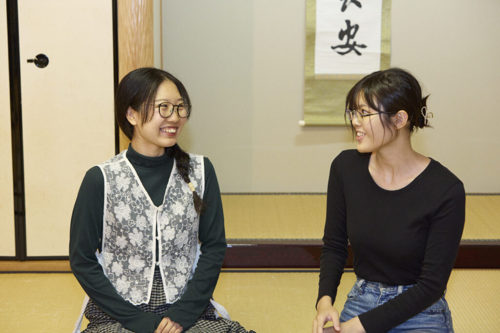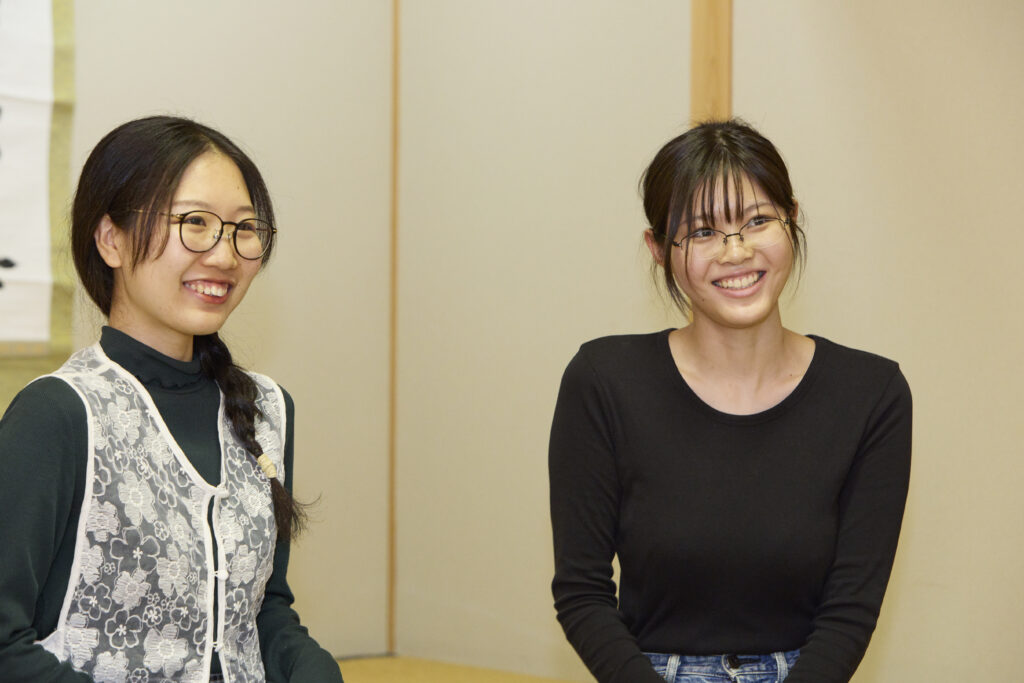 [新本さん]私は綾野先輩の行動力に惹かれました。自分も茶道未経験でしたが、何も分からないことに飛び込んでみても「意外と何とかなるな」って思えるようになったことが成長かもしれません。あと、部長であってもできることは限られていますし、今は人数も増えたので「周りに頼る力」がついた気がしますね。
