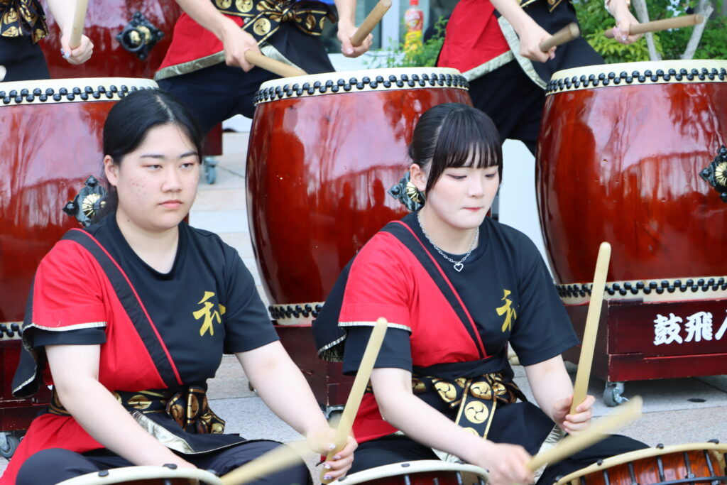 当日は、和太鼓部の力強い演舞からスタート!部員全員の一糸乱れぬ太鼓の音は、あべのハルカスに立ち寄った方も思わず足を止めて和太鼓部の演舞に夢中になってしまうほど。外国からのお客様も、スマートフォンを取り出して日本の和太鼓の音やパフォーマンスを撮影していました。