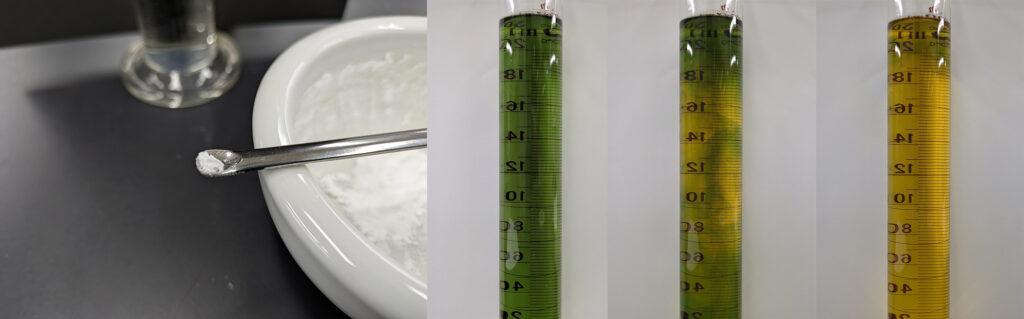 まず、最も中心的な取り組みとして、理科教育における指導方法の研究や教具の開発があります。例えば、現行の小学校学習指導要領が改訂された際、「水溶液の中では、溶けている物が均一に広がることにも触れること」という新たな内容が追加されました。これまでも「水溶液の均一性」について簡単に触れている教科書は存在しましたが、現行の学習指導要領の下では、より明確な指導が求められるようになりました。しかし、従来から「溶けたものは下の方にたまる(下の方が濃くなる)」と考える学習者が多いことが報告されています。いかにして水溶液の均一性について正しい理解を効果的に促すかが、指導上の課題となっています。この点に関して、BTB溶液とミョウバンという、学校現場でも一般的な二つの材料を用いることで、水溶液の均一性を容易に実感させることができます。ミョウバンは水に溶けると弱酸性を示すため、BTB溶液を加えた水にミョウバンを投入すると、ミョウバンが溶けた部分が緑色から黄色に変化し、やがて溶液全体が黄色になります。このように、色の変化を通して「溶けた物質が均一に広がる」様子、そして「均一な状態になった水溶液は長時間放置しても変化しない」様子を視覚的に確認できます。この実験は、水溶液の均一性について正しい理解を促すための定性的な観察実験として授業導入部分などで有効に活用できます。興味深いことに、BTB溶液とミョウバンの組み合わせに限らず、「指示薬を用いて水溶液の均一性を指導する」という試みは、これまで報告されておらず、新しい視点といえます。個々の材料や科学事象の本質を踏まえれば、特別な材料や機器を用いなくても、理科教育をより効果的にできる可能性はまだ多く残されていると考えています。こうした事例のほかにも、学習者の本質的理解や正しい科学概念の構築を目指し、学習者の内面の状態やその変容の評価を関連付けながら、幅広く研究を進めています。