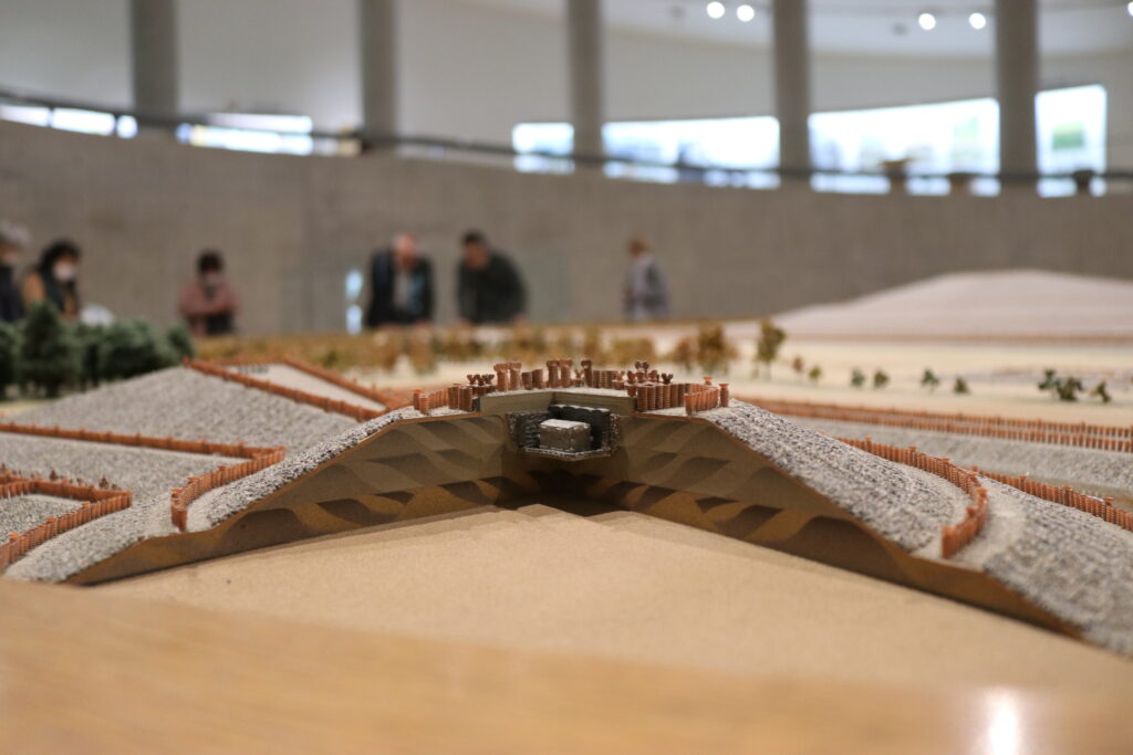中には歴史ミニチュア模型としては日本最大の仁徳陵古墳の復元模型や、古墳時代に重量物を運搬した「修羅」や金山古墳の家形石棺の実物大模型などが展示されており、学生も真剣に説明を聞いていました。