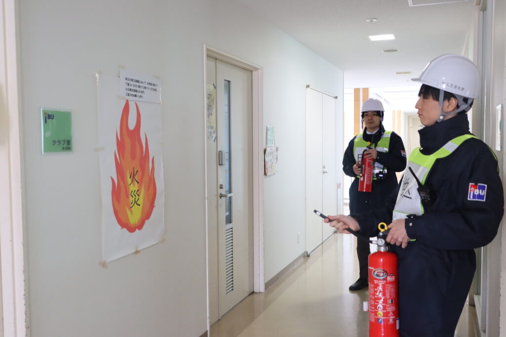 8号館では地震により出火を想定。災害対策本部の指示のもと消火部隊が駆け付け、消火活動を行いました。