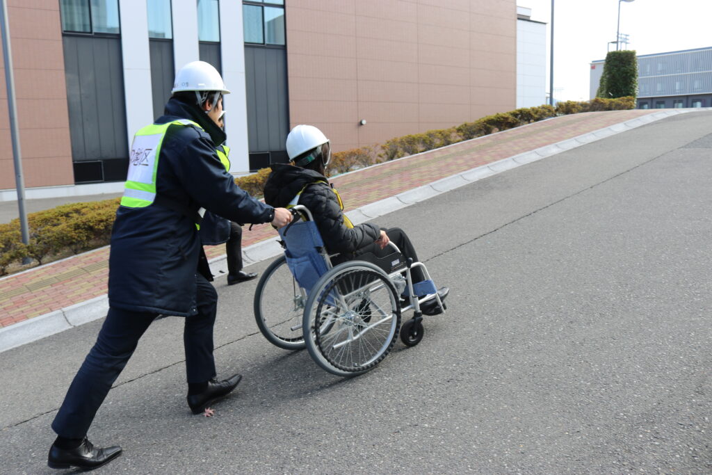 7号館では歩行のできない負傷者が発生したと想定。負傷者を、車椅子を使い保健センターへ搬送する訓練を行いました。