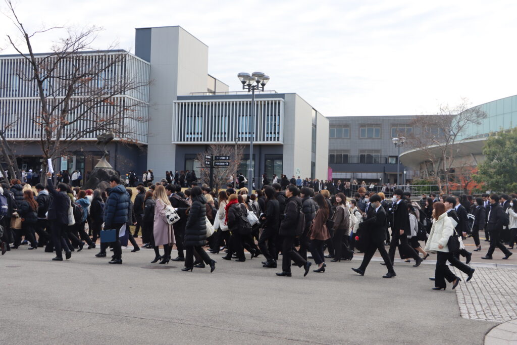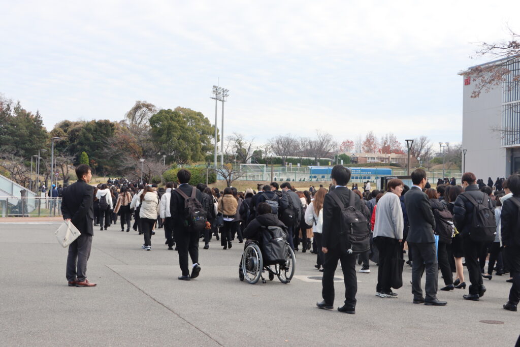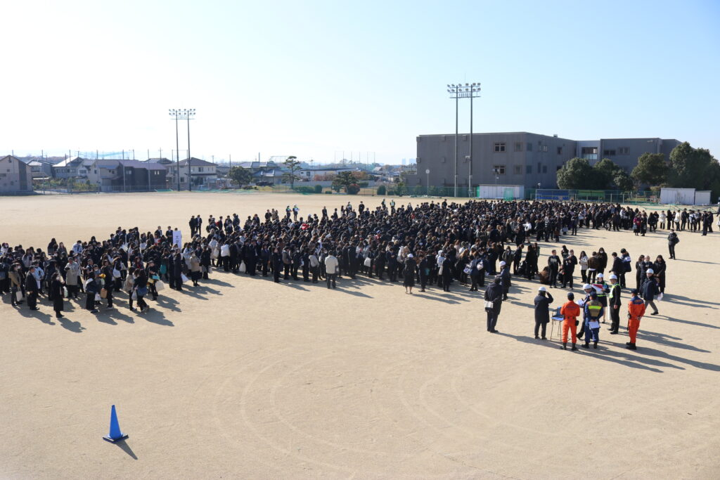 訓練は、12時に泉南市で震度6の地震が発生したことを想定し、「和の精神Ⅱ」を受講していた約1,000名の学生は、教職員の誘導に従い避難場所であるグラウンドに避難。グラウンドに避難した学生は、それぞれの学部・学科ごとに分かれ、地震への対応を学びました。また、安否確認システムにより本学のすべての学生と教職員に対し、安否確認や現在地など状況を把握する訓練を行いました。