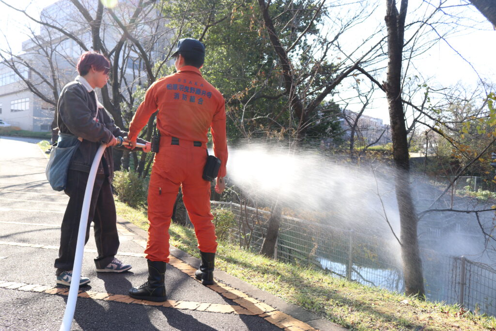 避難訓練終了後、希望者を対象に「消火器を使用した消火訓練」と「消火栓からの放水訓練」を実施。学生、教職員が慣れない消火作業を熱心に体験していました。