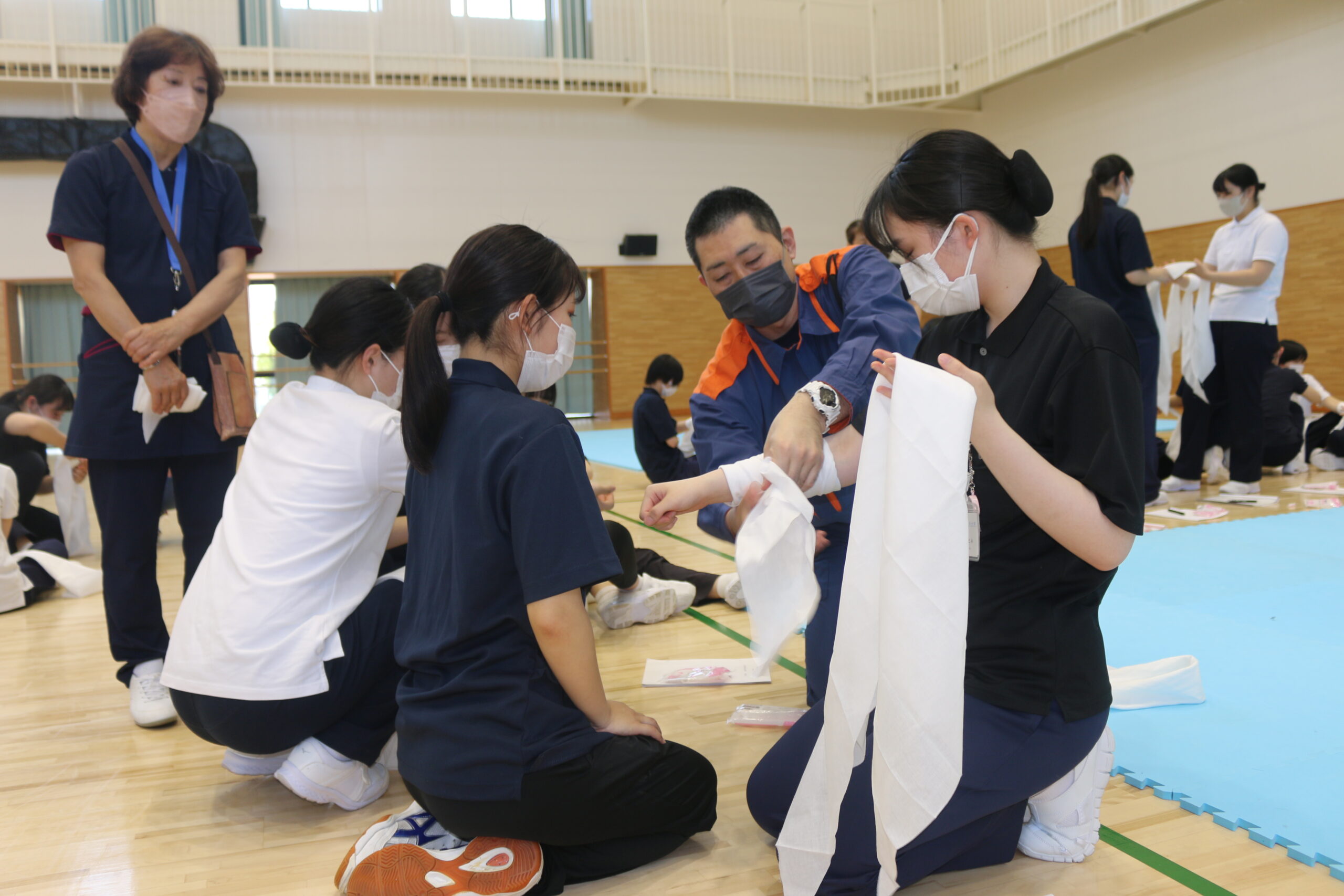 看護学部で、消防組合や大学院生の協力のもと災害時を想定した看護演習を実施